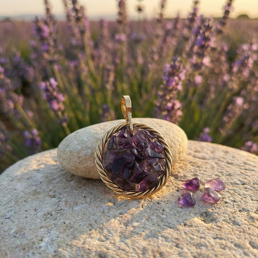 Charm con Amatista Bañada en Oro - Piedra de protección, tranquilidad y desarrollo espiritual - Latón