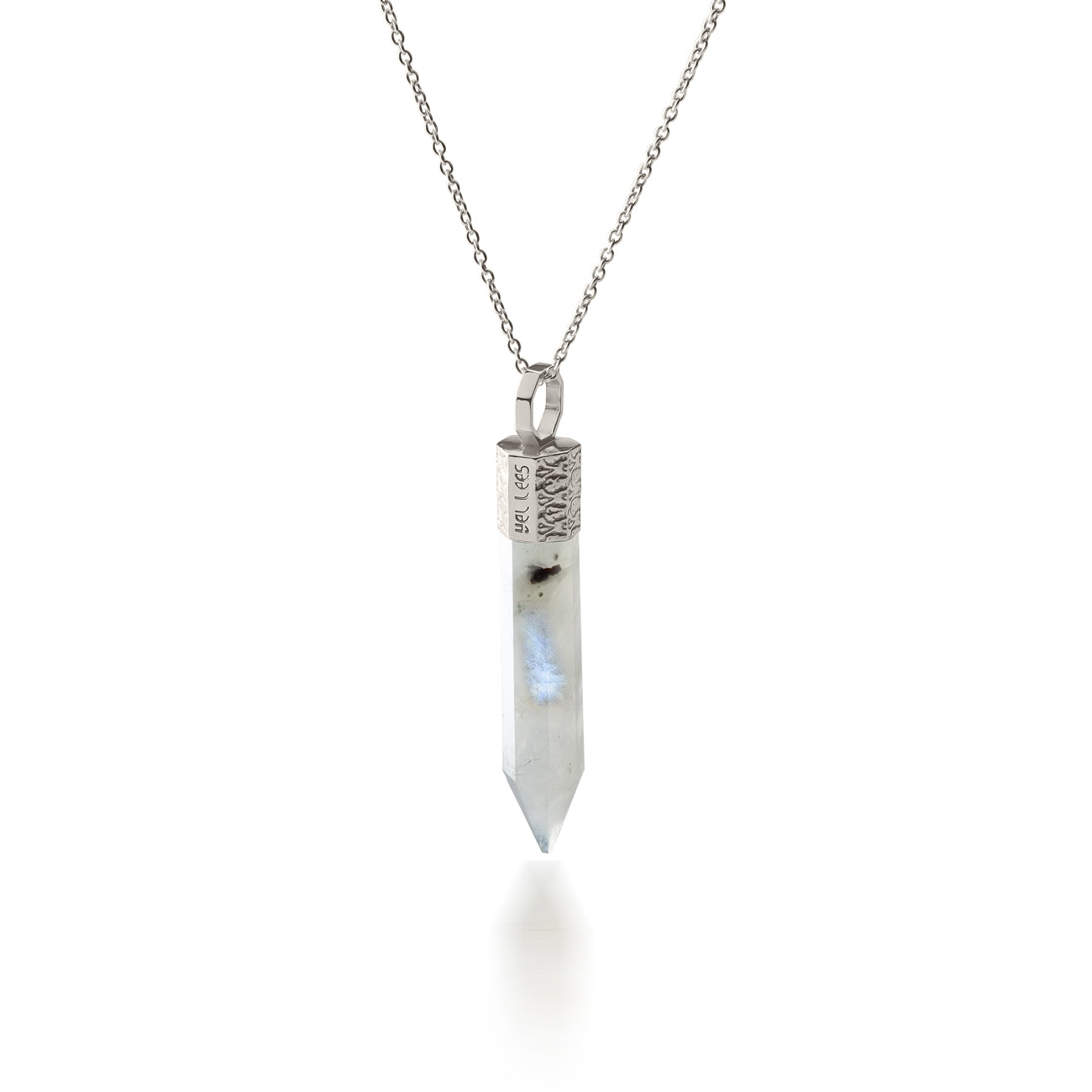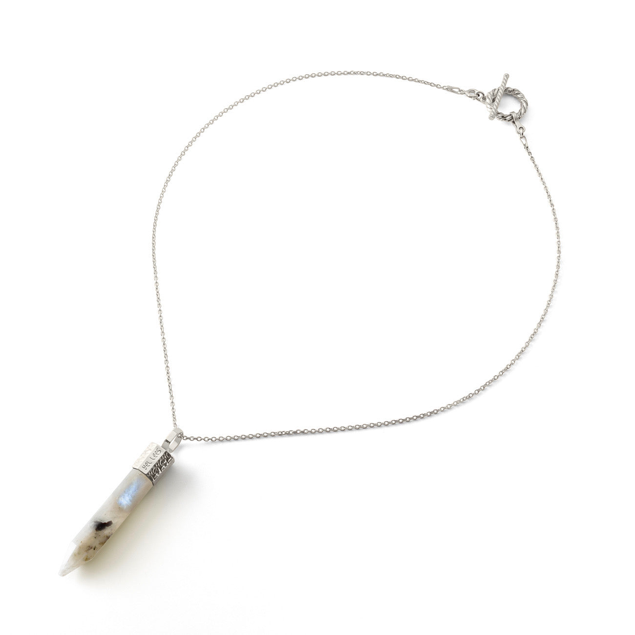Collar con piedra de la luna 44 mm plata 925 bañada en platino de la colección TERRA 44 Es un talismán de intuición, empatía y luz espiritual. Brinda consuelo, desarrolla la intuición y nos recuerda que cada sombra forma parte del ciclo de la luz. Ideal para personas sensibles y empáticas que buscan la paz interior.