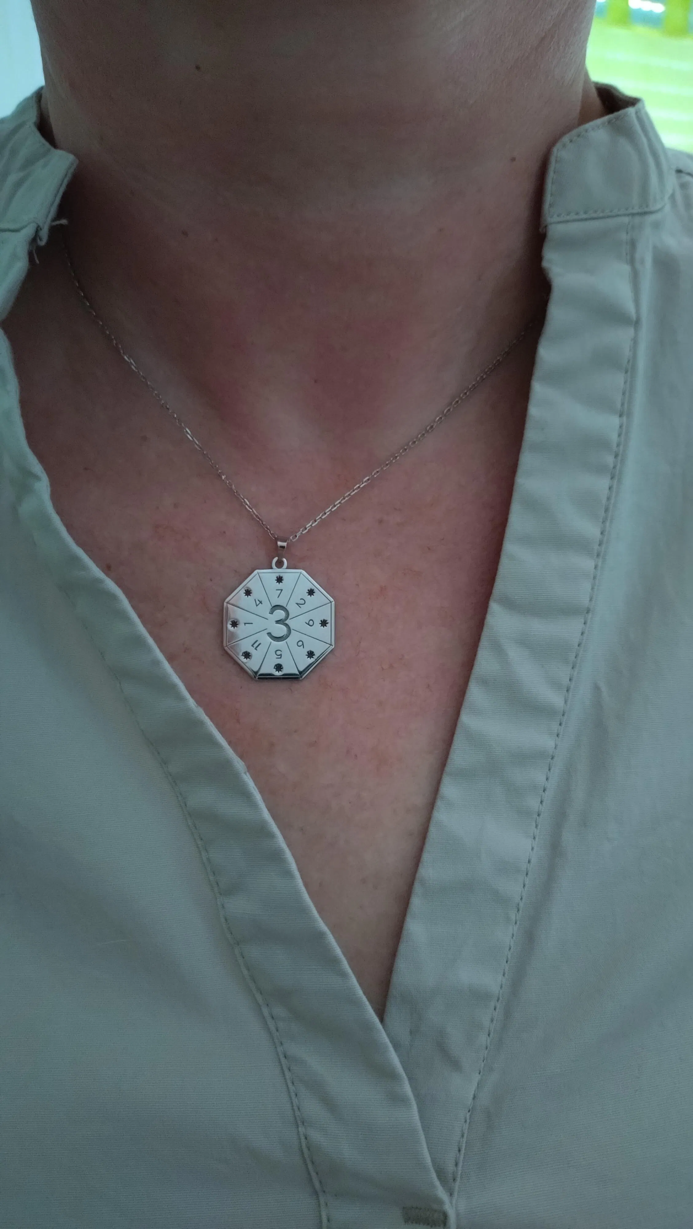 The Artist's Amulet was created as a ritual octagonal talisman made of 925 silver, coated with platinum. It is a geometric seal of expression, engraved with the number 3 – the number of joy, communication, and creation.