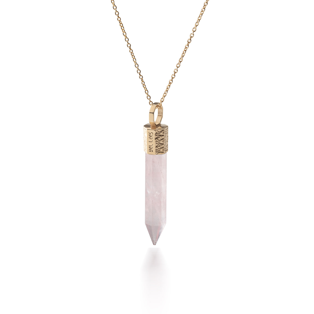 Zawieszka z kwarcem różowym 44 mm z mosiądzu 925 pozłacanego z kolekcji TERRA 44 to talizman serca i miłości. Łączy w sobie delikatność, empatię i duchową równowagę. Idealny dla osób, które pragną żyć w zgodzie z uczuciami, przyciągać harmonię i pielęgnować ciepło relacji.